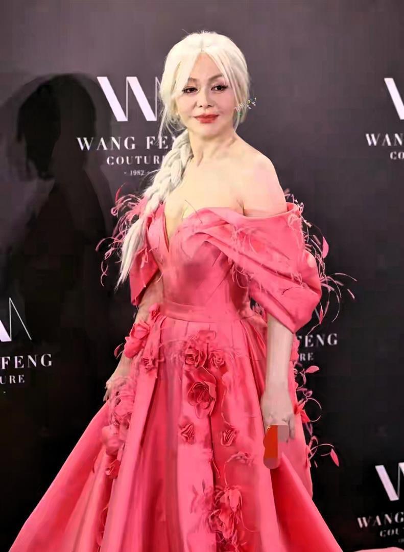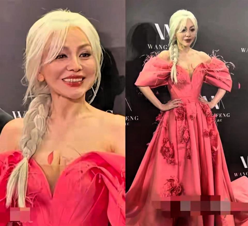 镜头转到上海时装周。 56岁的“雪姨”王琳,选择了一条深V粉色花朵裙,顶着一头白色假发,说要COS艾莎公主。 远看,身材确实保持得不错,完全不像年过半百的人。