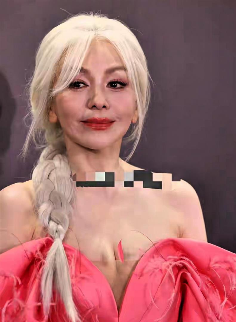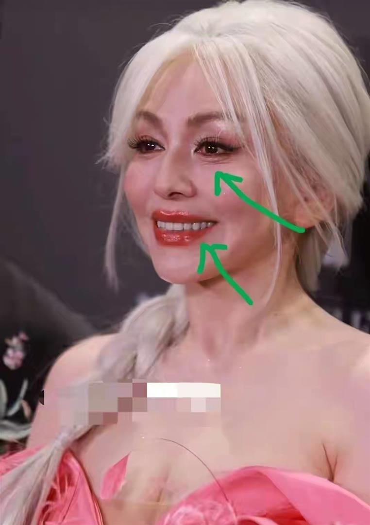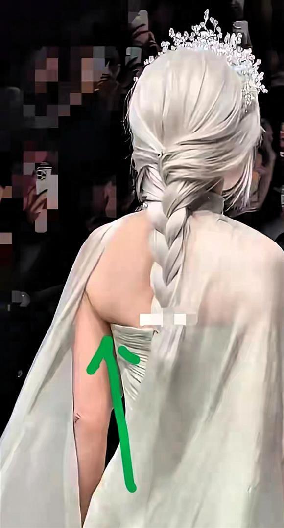 可镜头一拉近,问题就来了。 厚重的妆容盖不住脸上的纹路,鼻翼和法令纹处卡粉明显,整个妆面显得不够干净。 那抹鲜艳的口红,更添了一丝俗气。 最让人出戏的是深V礼服,为了效果硬挤事业线,反而有种说不出的违和感。 转身走秀时,腰侧被礼服勒出的赘肉也暴露无遗。