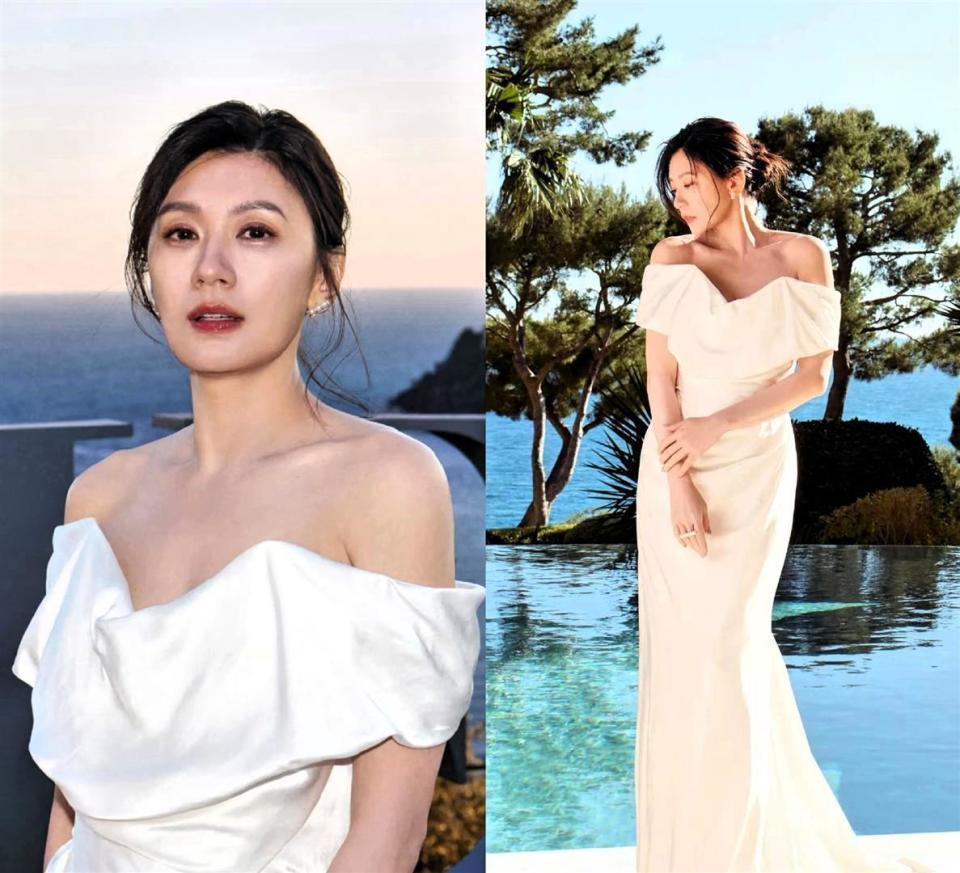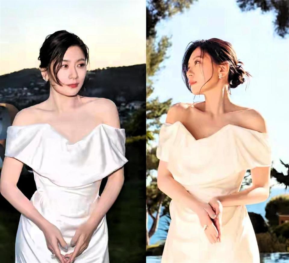 先看南法的贾静雯。 许久没公开露面的她,受邀参加一个高端珠宝品牌活动。 一袭简约的白色一字领缎面长裙,配上低盘发和清淡妆容,整个人往那儿一站,就俩字:舒服。 没有刻意露肤,没有花哨设计,但那种温婉大气的劲儿全出来了。