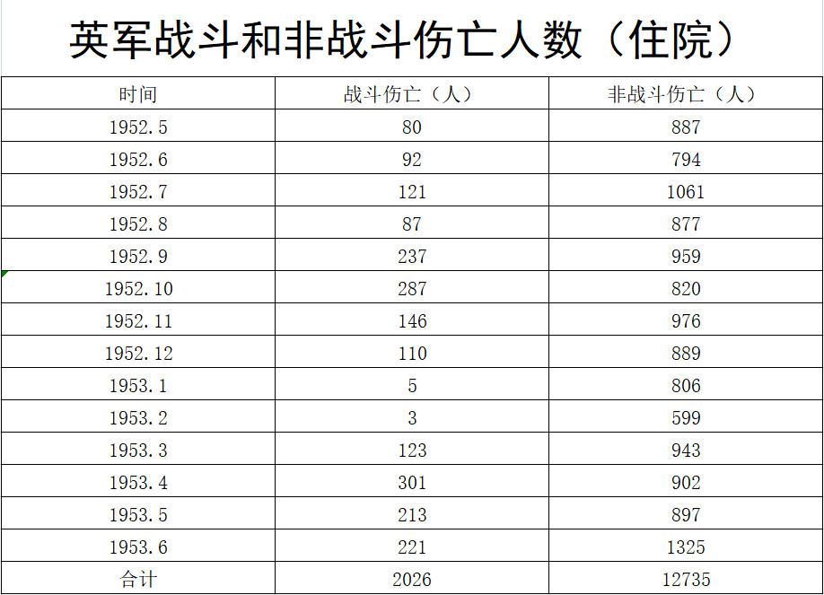 我们可以看到,1952年5月至1953年6月,英军战斗伤亡2026人,非战斗伤亡12735人,比例高达1:6.29,其中很多月份比例高达1:10,1953年1月和2月甚至高达离谱的1:160和1:200。1953年1月,总共5人战斗伤亡,非战斗伤亡居然有806人;1953年2月,总共才3人战斗伤亡,非战斗伤亡是离谱的599人。