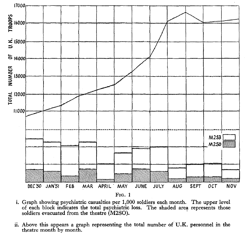 而且英国人对于战场应激反应的研究远远滞后于美军,英军并不懂很多身体上的症状其实是精神病症状。1952年8月,英军终于发现了这个问题,医疗服务部助理主任史密斯上校指出:“慢性腰痛、胃肠紊乱和血管舒缩症状通常是身体对焦虑、怨恨或士气低落的反应。”很快,英军进一步发现“呼吸、胃肠和皮肤反应,很可能代表了心理痛苦的躯体表达。”