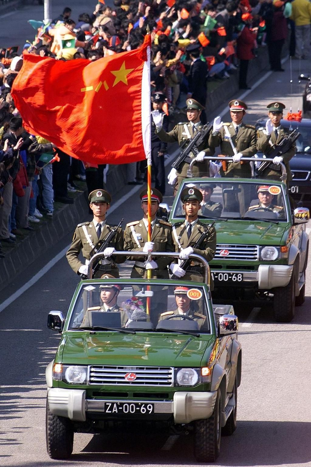 ▼1999年12月20日,广东珠海,20万市民在街头欢送解放军进驻澳门。