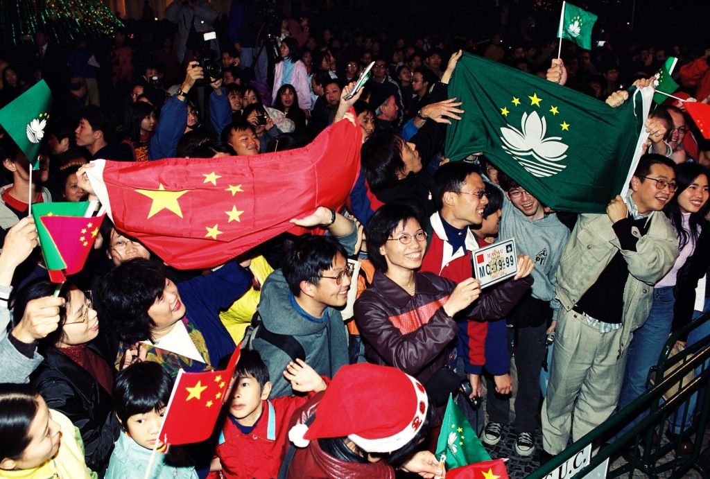 ▼1999年12月20日凌晨,澳门,民众在街头高举着中国国旗和澳门区旗,庆祝澳门回归祖国。