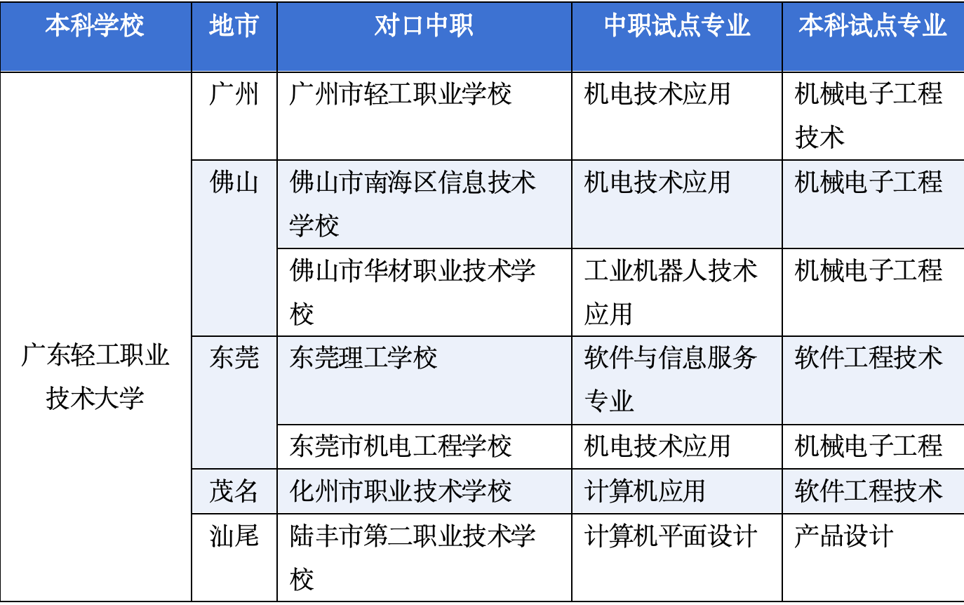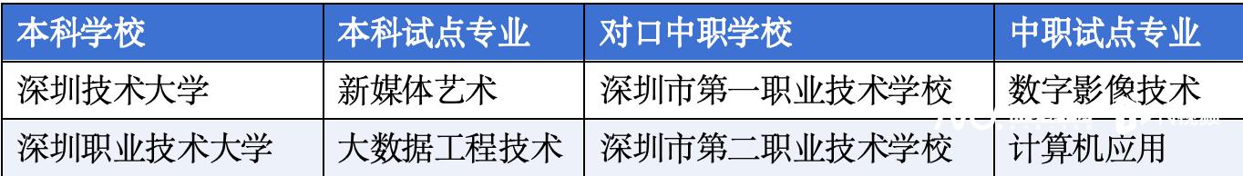深圳职业技术大学对接1所中职,为深二职。广州科技职业技术大学是全国首批民办职教本科,亦参与试点,对接了2所学校,分别为江门市第一职业高级中学、茂名市第一职业技术学校。民办高校参与试点的还有广州软件学院、湛江科技学院、珠海科技学院。