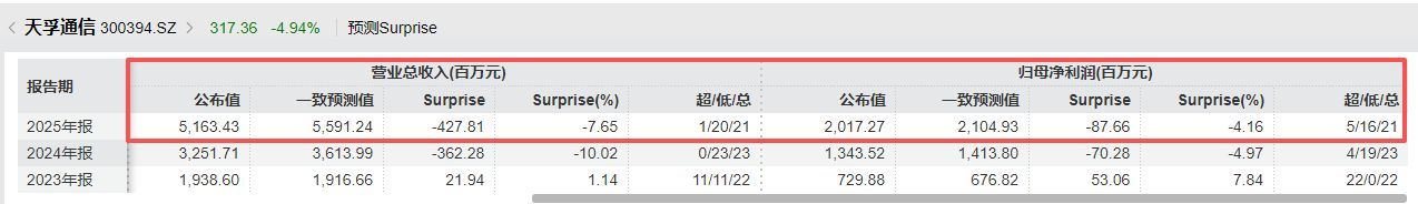 据万得金融终端汇编的数据,21家机构对天孚通信2025年营收和归母净利润的一致预测值分别为约55.91亿元和21.05亿元。因此,按照天孚通信披露的数据来看是均不及预期的,公布值较一致预测值分别少了7.65%和4.16%。